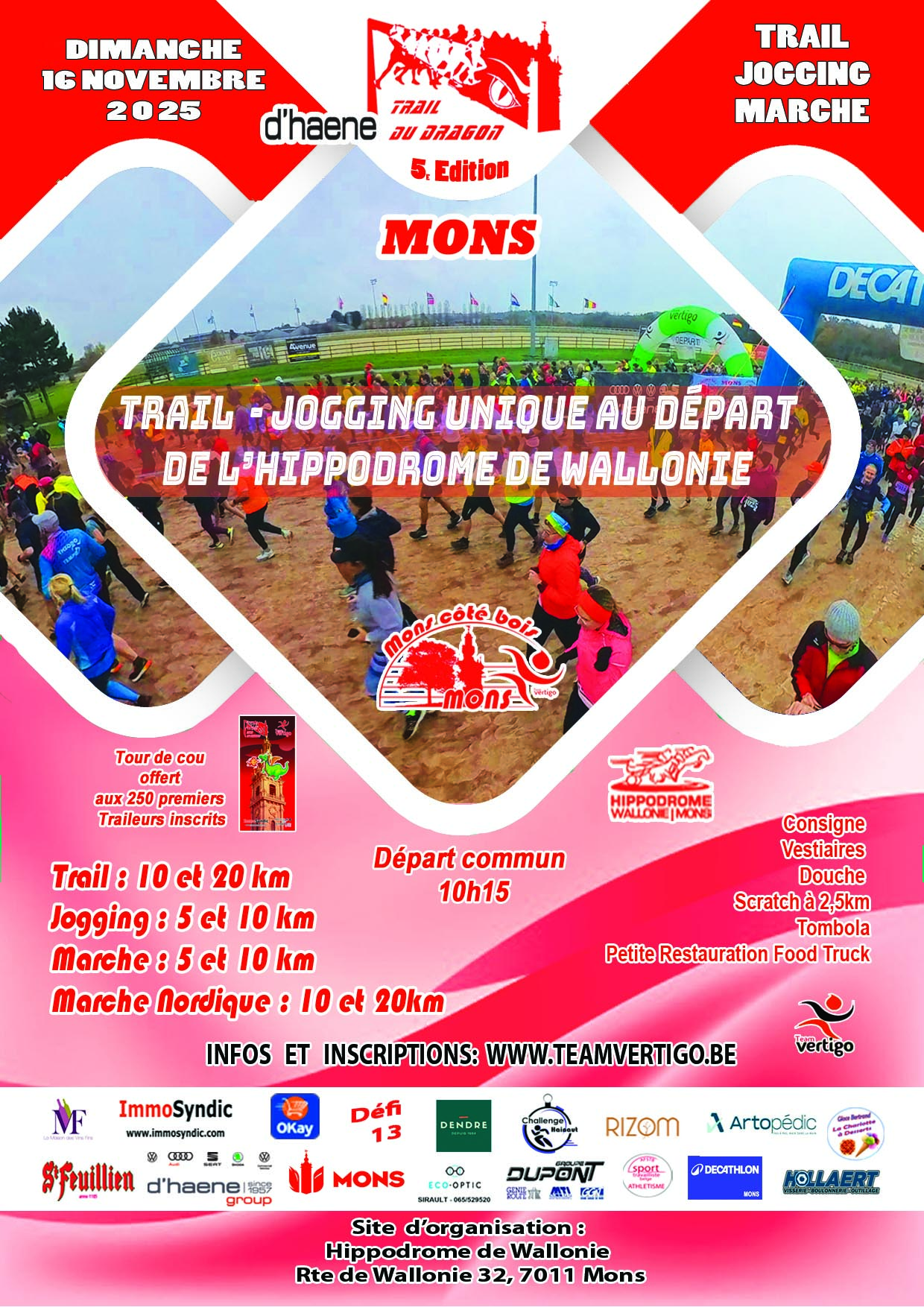 Retrait des dossards possible la veille de la course de 14h à 16h au magasin Décathlon de Mons (10% sur un article running / santé dec. du client présentant son dossard en caisse) ou le jour de la course à partir de 8h30 jusque 10h00.